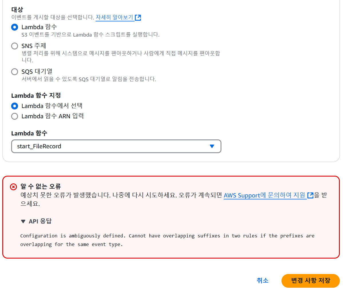 - 따라서 동일한 S3 버킷 전체에 대한 이벤트 알림 생성시 중복됨